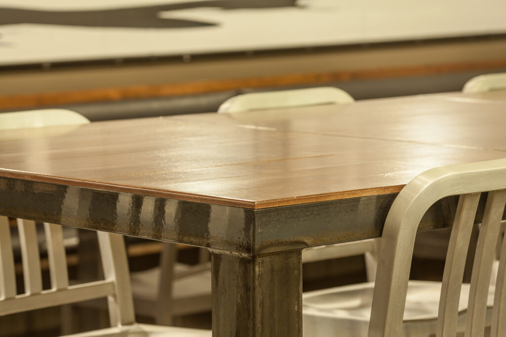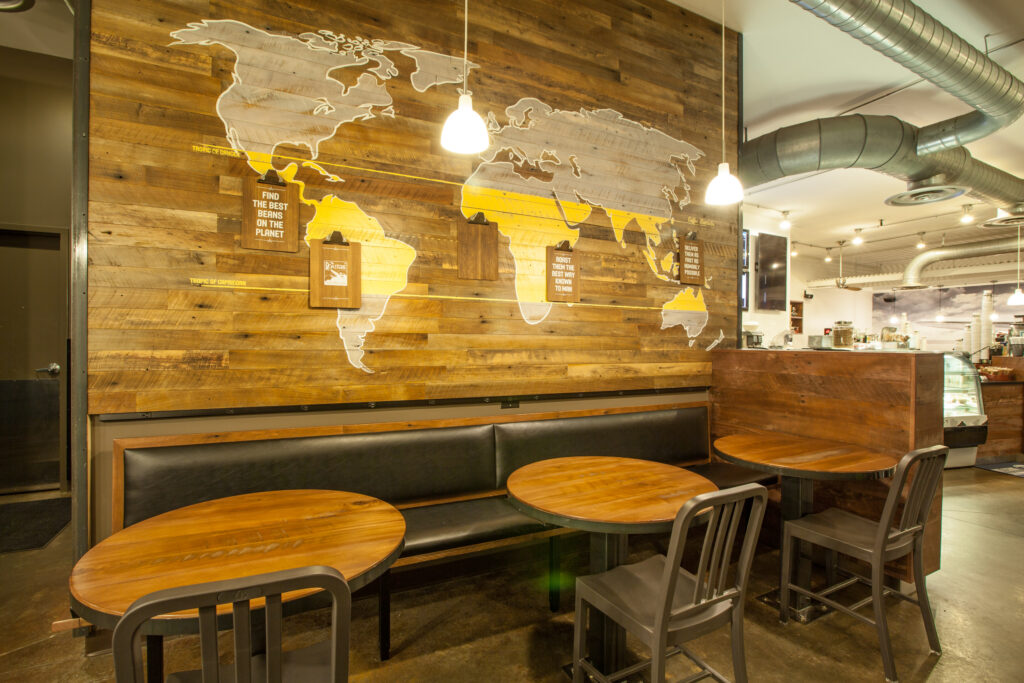 The wall mounted bottle racks are particularly cool using reclaimed materials, as well as using those materials in all of the steel framed table tops.